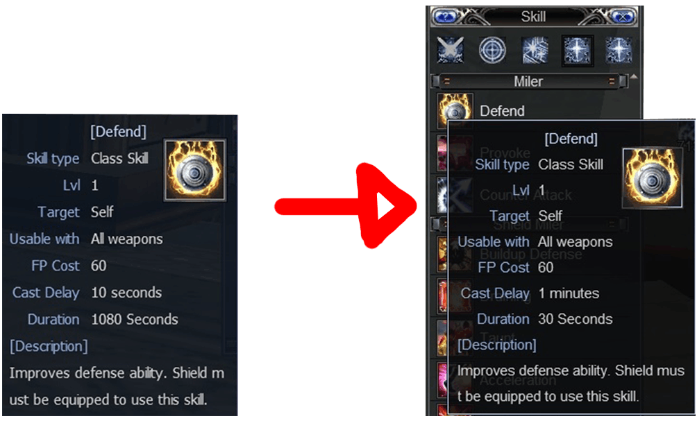 Skill Defend (Bellato Miller) cast delay changed to 1 minutes, and cooldown reduced to 30 second in RF Online Update Latest : Dragonborn Patch.